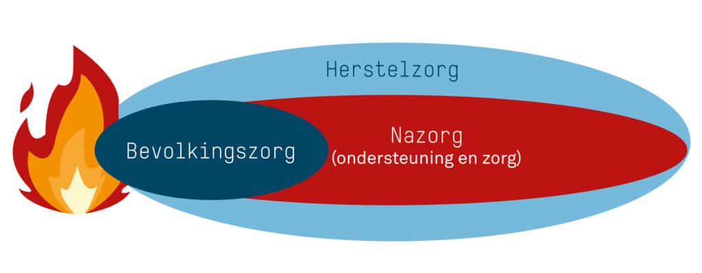‘Nazorg’ is gericht op psychosociale ondersteuning en zorg voor getroffen burgers en professionals (de mens) en loopt van de acute fase langdurig door in de nafase. Datzelfde geldt voor ‘herstelzorg’ dat verder gaat dan mensen, maar ook dieren, materiële zaken, culturele aspecten en de sociale en fysieke leefomgeving omvat, inclusief maatschappelijke randvoorwaarden zoals openbaar bestuur en rechtspraak (zie Dückers, M. & Van Zutphen, R. (2025). Herstelzorg. Basisboek crisisbeheersing. Boom).