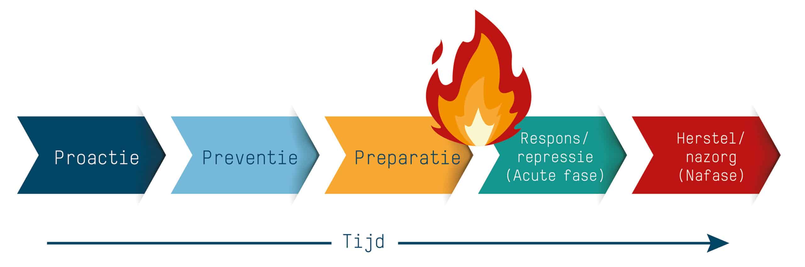 In figuur 1 is de veiligheidsketen weergegeven. Te zien is hoe oog voor risico’s (proactie) wordt gevolgd door maatregelen om risico’s te beheersen (preventie) en capaciteit op te bouwen voor als het mis mocht gaan (preparatie). Zodra de ramp zich voltrekt, zal de inzet in de acute fase gericht zijn op het bestrijden en indammen van de dreiging (respons/repressie).